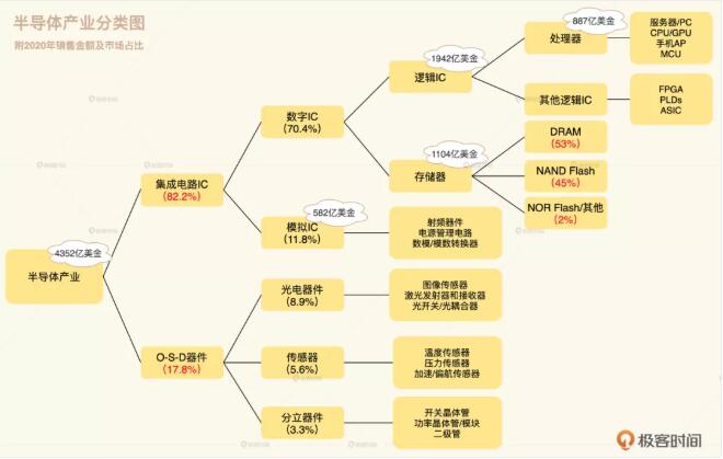事實上當然不是這樣,在這分享給你一個我收藏的「半導體行業(yè)分類圖」,圖里的數(shù)據(jù)都來自半導體行業(yè)權(quán)威的市場研究機構(gòu) IC Insights 的[敏感詞]市場統(tǒng)計,[敏感詞]準確又客觀。