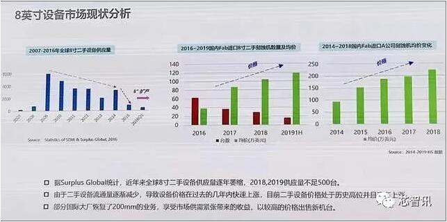 根據(jù)Surplus Global統(tǒng)計(jì),近年來(lái)全球8英寸二手設(shè)備供應(yīng)量逐年萎縮,2018、2019年供應(yīng)已不足500臺(tái)。且二手8吋設(shè)備的均價(jià)也呈逐年大幅上漲的趨勢(shì)。而新建一個(gè)月產(chǎn)能9萬(wàn)片的8英寸成熟制程工廠,大約需要800臺(tái)各類(lèi)設(shè)備。