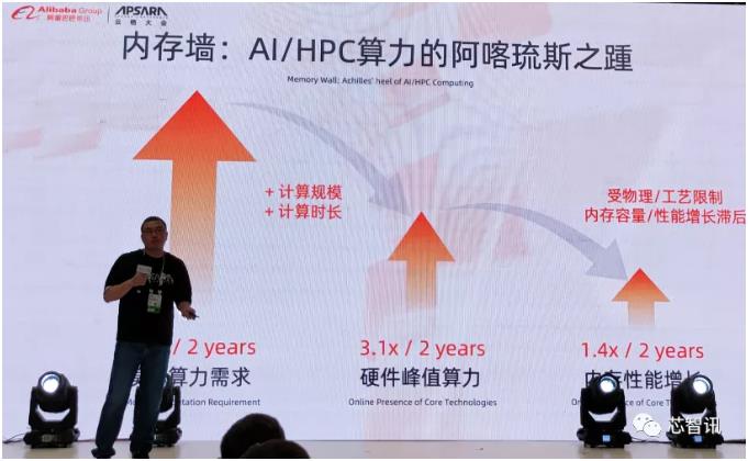 目前內(nèi)存性能的提升速度嚴重滯后于處理器性能提升的速度,這就好比一個漏斗,寬的一端是處理器,而狹窄的一端則是存儲器,后者的性能極大地影響了數(shù)據(jù)傳輸?shù)乃俣?,這也被認為是傳統(tǒng)計算機的阿克琉斯之踵。這一點在AI/HPC計算領(lǐng)域尤為明顯。