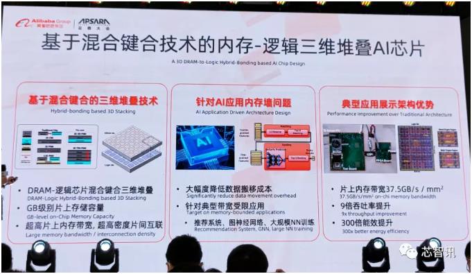 此次,達摩院研發(fā)的芯片首次采用混合鍵合(Hybrid Bonding)的3D堆疊技術(shù)——將邏輯計算芯片和DRAM存儲芯片face-to-face地用特定金屬材質(zhì)和工藝進行互聯(lián),實現(xiàn)了炒高片上內(nèi)存帶寬,炒高密度片間互聯(lián)。