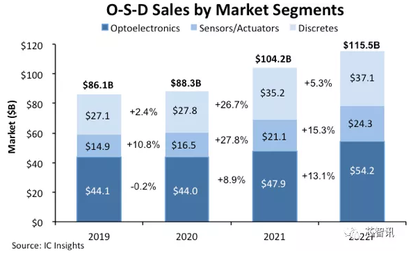 到 2022 年,IC Insights 的 OSD 總收入將增長 11% 至 1155 億美元,其中光電子將增長 13% 至 542 億美元,傳感器/執(zhí)行器將增長 15% 至 243 美元。預(yù)計將達(dá)到 1 億美元和分立器件市場將下滑。它將恢復(fù)到 371 億美元,正常增長率為 5%。