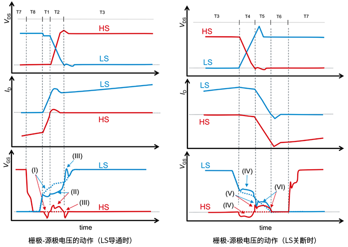 下面的波形圖表示該電路中LS導(dǎo)通時和關(guān)斷時的漏極-源極電壓(VDS)和漏極電流(ID)的波形,以及柵極-源極電壓(VGS)的動作。橫軸表示時間,時間范圍Tk(k=1~8)的定義如下: