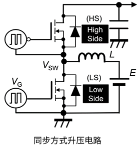 在下方所示的電路圖中,展示了一種在橋式結(jié)構(gòu)中使用SiC MOSFET時最簡單的同步升壓(Boost)電路。在這個電路中,高邊(HS)SiC MOSFET與低邊(LS)SiC MOSFET的開關(guān)同步進行開關(guān)。具體來說,當(dāng)LS導(dǎo)通時,HS關(guān)斷,而當(dāng)LS關(guān)斷時,HS導(dǎo)通,這樣交替導(dǎo)通和關(guān)斷。
