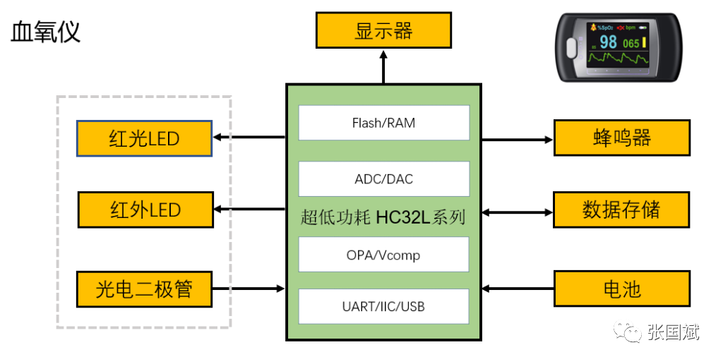 據(jù)介紹,華大血氧儀通過檢測充血人體末梢組織,對不同波長的紅光和紅外光的吸光度變化率之比推算組織的動(dòng)脈血氧飽和度。方案是基于華大半導(dǎo)體自主研發(fā)的HC32L系列超低功耗MCU芯片產(chǎn)品,具有高整合度、高抗干擾、高可靠性和超低功耗的特點(diǎn),HC32L系列芯片產(chǎn)品采用Cortex-M0+內(nèi)核,集成豐富的外設(shè)功能,包括各種定時(shí)器、LCD控制器、ADC/DAC、Vcomp比較器、OPA運(yùn)放等,以及UART、SPI、I2C等多種通訊接口,特別適用于額溫槍、血氧儀等相關(guān)便攜式醫(yī)療電子設(shè)備。