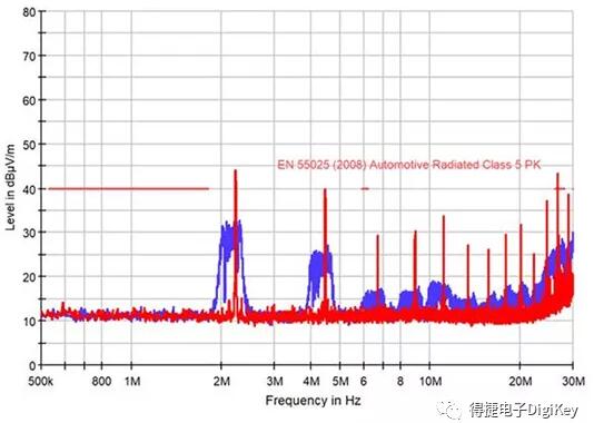 圖2:使用固定基本頻率(紅色)的開關(guān)穩(wěn)壓器與采用頻率抖動(藍(lán)色)的穩(wěn)壓器輻射發(fā)射頻譜對比。工作參數(shù):fOSC = 2.2MHz,VIN = 12V,VOUT= 3.3V,負(fù)載 = 3A。(圖片來源:Allegro Microsystems)