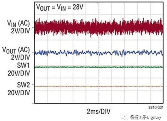 圖3:在直通模式下,即使面對高噪聲輸入源(紅色跡線),LT8210穩(wěn)壓器亦可減小輸出電壓紋波(藍(lán)色跡線)。(圖片來源:Analog Devices)
