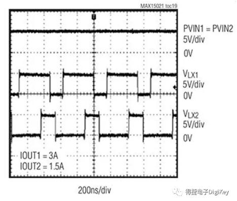 圖5:MAX15021雙通道穩(wěn)壓器可實現(xiàn)180°異相工作以抑制EMI。(圖片來源:Maxim Integrated)