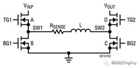 VIN在VOUT(BOOST)與VOUT(BUCK)之間時,輸出電壓追蹤輸入電壓。一旦VOUT趨近于VIN,LT8210就會進(jìn)入低功耗狀態(tài)(直通模式),即開關(guān)A和D持續(xù)導(dǎo)通,而開關(guān)B和C關(guān)斷。VOUT超出VIN達(dá)到設(shè)定百分比時,開關(guān)A、C 和 D關(guān)斷,直至放電使輸出電壓與VIN幾乎相等時,才重新連接輸出。如果處于(非開關(guān))直通窗口內(nèi)時輸入出現(xiàn)正瞬變,使得VIN超出VOUT達(dá)到設(shè)定百分比,則開關(guān)將重新導(dǎo)通,以防電感器電流中出現(xiàn)較大幅度瞬時振蕩。此時,輸出電壓將逐漸接近輸入電壓,方式類似于軟啟動,而VOUT趨近于VIN時,開關(guān)A和D將再次持續(xù)導(dǎo)通。開關(guān)拓?fù)淙鐖D4所示。