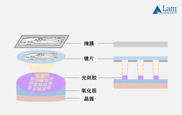 在晶圓上覆蓋光刻膠薄膜后,就可以通過控制光線照射來完成電路印刷,這個過程被稱為“曝光”。我們可以通過曝光設備來選擇性地通過光線,當光線穿過包含電路圖案的掩膜時,就能將電路印制到下方涂有光刻膠薄膜的晶圓上。