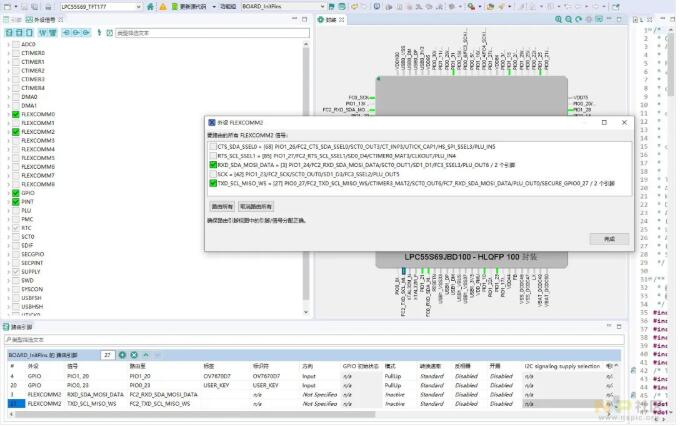 這里簡(jiǎn)單說(shuō)一下ESP8266的使用。論壇里會(huì)玩ESP8266的大佬太多,不敢造次。所以我盡力用最簡(jiǎn)單的語(yǔ)言把ESP8266相關(guān)的部分說(shuō)清楚。在物趣系列的設(shè)計(jì)中,ESP8266僅用作和云端服務(wù)器傳遞數(shù)據(jù)的手段,不涉及其二次開(kāi)發(fā)。LPC55S69引腳路由如下圖。