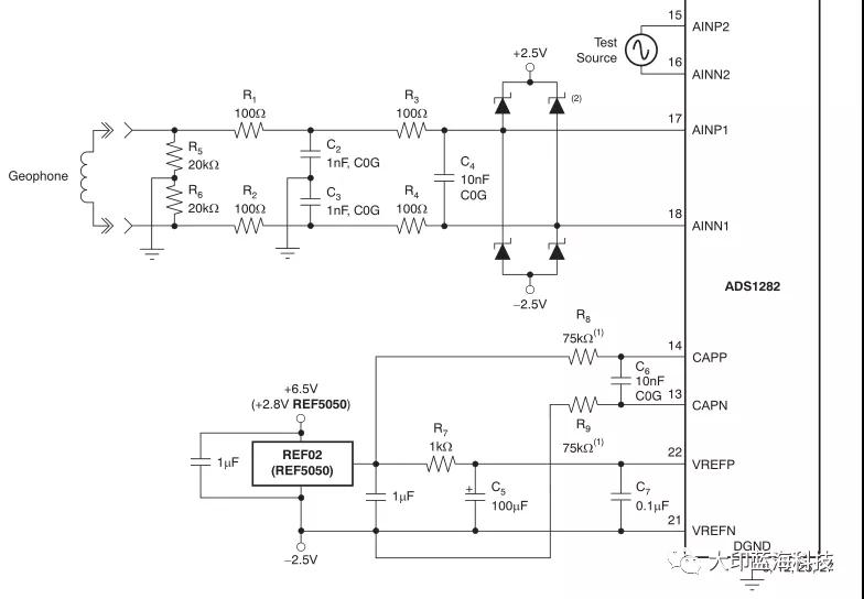 ADS1282配合外置Vref正負(fù)基準(zhǔn)電壓的外部接線示意圖