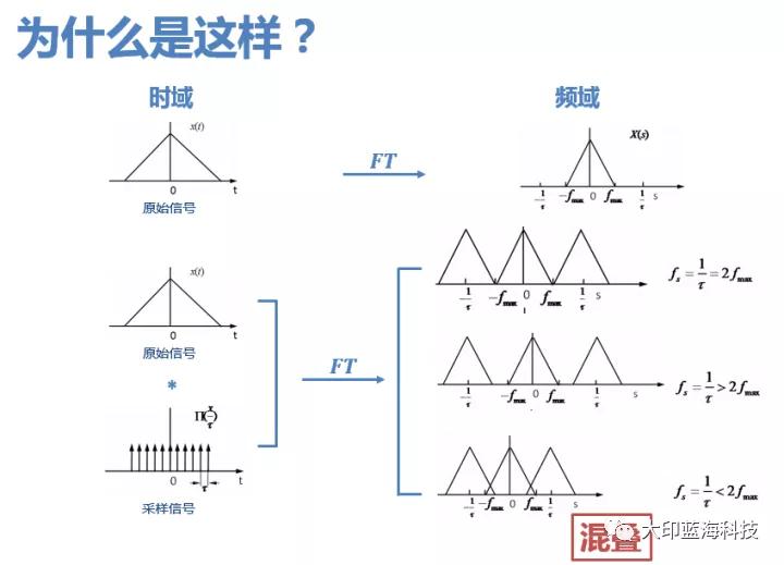 3. 至于為什么是兩倍,學(xué)過信號處理的同學(xué)應(yīng)該都知道,時域以τ為間隔進行采樣,頻域會以1/τ為周期發(fā)生周期延拓。那么如果采樣頻率低于兩倍的信號[敏感詞]頻率,信號在頻域頻譜搬移后就會發(fā)生混疊。