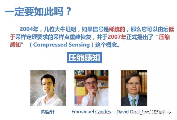 4. 然而這看似不容置疑的定律卻受到了幾位大神的挑戰(zhàn)。Candes最早意識到了突破的可能,并在不世出的數(shù)學(xué)天才陶哲軒以及Candes的老師Donoho的協(xié)助下,提出了壓縮感知理論,該理論認(rèn)為:如果信號是稀疏的,那么它可以由遠(yuǎn)低于采樣定理要求的采樣點重建恢復(fù)。