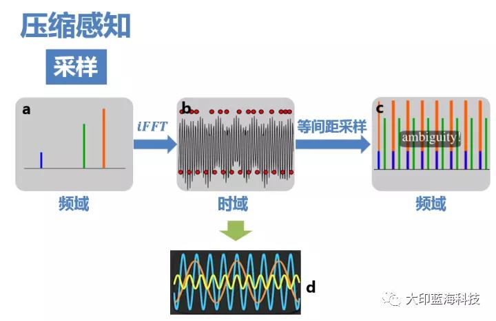 上圖非常關(guān)鍵,它可以簡單直觀地表述壓縮感知的思路。如圖b、d為三個余弦函數(shù)信號疊加構(gòu)成的信號,在頻域的分布只有三條線(圖a)。如果對其進行8倍于全采樣的等間距亞采樣(圖b下方的紅點),則頻域信號周期延拓后,就會發(fā)生混疊(圖c),無法從結(jié)果中復(fù)原出原信號。