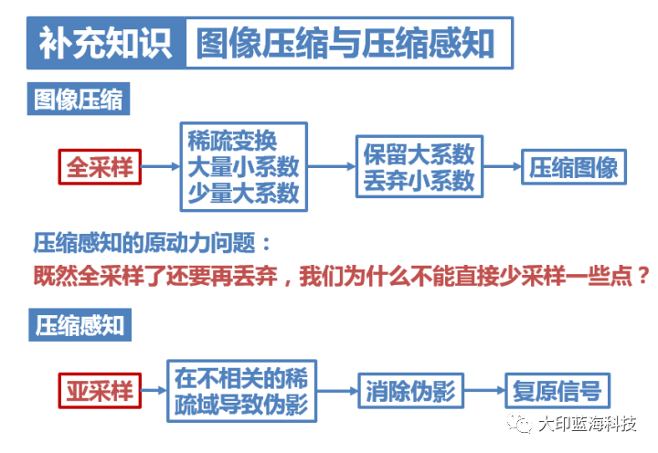 而壓縮感知不同,它的思想其實從圖像壓縮中借鑒了很多:既然全采樣了還要再丟棄,我們?yōu)槭裁床荒苤苯由俨蓸右恍c?因此,壓縮感知直接進行了亞采樣,然后再用算法消除亞采樣導(dǎo)致的偽影??梢哉f,壓縮感知直接在采樣時就完成了壓縮。