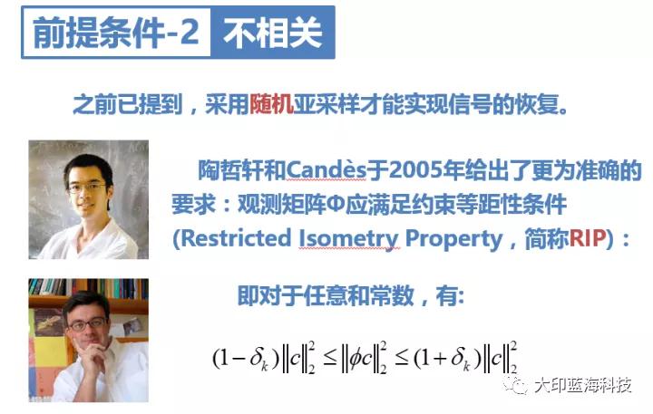 17.接下來的數(shù)學(xué)內(nèi)容可以簡短略過:陶大神和Candès大神證明了RIP才是觀測矩陣要滿足的準(zhǔn)確要求。但是,要確認(rèn)一個矩陣是否滿足RIP非常復(fù)雜。于是Baraniuk證明:RIP的等價條件是觀測矩陣和稀疏表示基不相關(guān)(incoherent)。