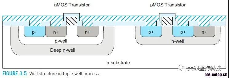 Deepnwell相當(dāng)于組成兩個背靠背的二極管,所以可以隔離p襯底耦合過來的噪聲, 更加強的噪聲隔離工藝是SOI絕緣體上硅工藝