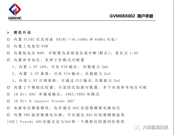 健天電子GVM08X002 8位MCU內(nèi)置2.5V基準(zhǔn), 1.5V可調(diào)基準(zhǔn)輸出,輸出負(fù)載能力為2uA