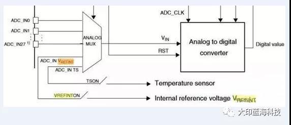 這里提前厘清下:該內(nèi)部參考電壓VREFINT并非ADC的參考電壓,ADC的參考電壓依然是VDD。即使VDD有所波動,這個VREFINT電壓恒定不變,對于ADC電路而言,它只是個測試點。這里經(jīng)常有人犯迷糊,把VREFINT內(nèi)部基準(zhǔn)參考電壓跟ADC模塊的參考電壓混為一談。