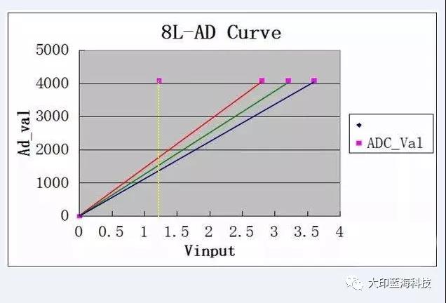 在某一固定的ADC參考電壓情況下,所有被測電壓點的AD轉(zhuǎn)換值與該點電壓值保持同一比例關(guān)系,換句話說,對于ADC參考電壓固定情況下,各點的電壓與ADC值與成線性關(guān)系。