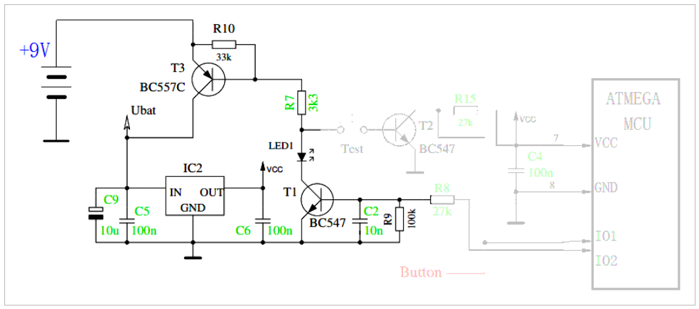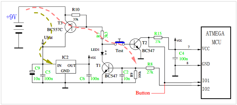 按動(dòng)按鈕“TEST”啟動(dòng)電路,T3的基極通過(guò)R7,Test,T2的b-e接地,從而使得T3導(dǎo)通。此時(shí)+9V通過(guò)T3加到IC2穩(wěn)壓芯片。IC2輸出VCC是加到單片機(jī)上。
