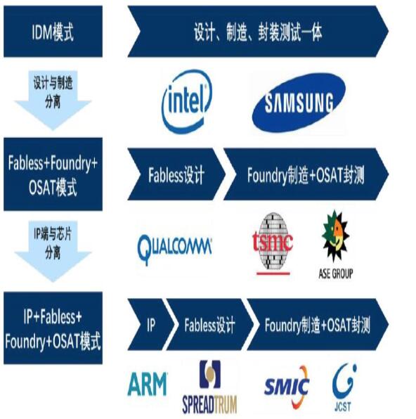上世紀(jì)80年代,電子行業(yè)出現(xiàn)了幾種新的分工模式,包括IDM模式、Fabless模式和Fundary模式。