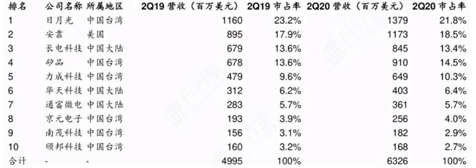 中國封裝業(yè)起步早、發(fā)展快,但目前仍以傳統(tǒng)封裝為主。雖然近年中國本土先進(jìn)封測四強(qiáng)(長電 、通富 、華天 、晶方 )通過自主研發(fā)和兼并收購,已基本形成先進(jìn)封裝的產(chǎn)業(yè)化能力。 根據(jù)TrendForce數(shù)據(jù),2020年二季度本土廠商長電/華天/通富分別以13.4%/6.4%/5.7%的市占率位居全球封測市場的第三/第六/第七。 2020年第二季度全球前十大半導(dǎo)體封測廠商: