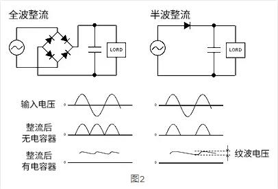 圖2為屬于整流基本種類的全波整流,以及半波整流的作用。無論哪方,都是將輸入的AC電壓和二極管相接,抓到負(fù)向波的振幅。半波整流只使用1個二極管,來抓到負(fù)向波的振幅,因此負(fù)向波消失,只剩下一半的波形,故稱半波。全波整流使用了由4個二極管組成的橋式二極管,能旋轉(zhuǎn)負(fù)向波,讓它出現(xiàn)在正向波區(qū)域內(nèi),而能顯示全波形的就是DC。