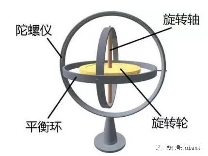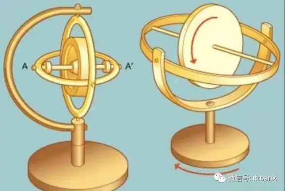 最早的陀螺儀的簡(jiǎn)易制作方式如下:即將一個(gè)高速旋轉(zhuǎn)的陀螺放到一個(gè)萬(wàn)向支架上,靠陀螺的方向來(lái)計(jì)算角速度,簡(jiǎn)易圖如下圖所示。