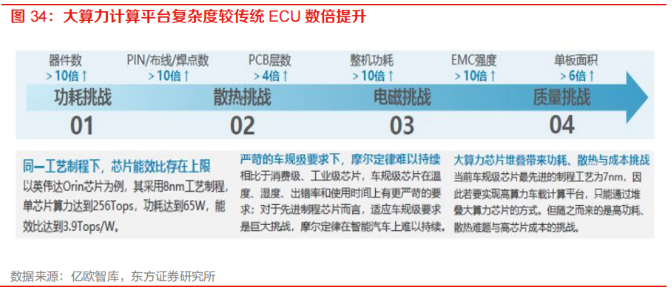 2、功耗:為支持并兼容 L3 及以上智能駕駛系統(tǒng)數(shù)量與類型繁多的傳感器與執(zhí)行器需求,車載計(jì)算平臺(tái)多采用異構(gòu)芯片硬件方案,以滿足系統(tǒng)接口與算力需求。相較傳統(tǒng) ECU,車載計(jì)算平臺(tái)的復(fù)雜度呈數(shù)倍提升,面臨功耗、散熱、電磁、質(zhì)量等多重挑戰(zhàn),存在著物理上限。因此,盡管當(dāng)前行業(yè)普遍以“TOPS” 為單位來(lái)評(píng)估自動(dòng)駕駛芯片的理論峰值算力,各大芯片廠商也不斷刷新算力峰值,但在實(shí)際場(chǎng)景下的算力有效利用率卻不高,自動(dòng)駕駛芯片理論峰值算力并不一定能在實(shí)際運(yùn)行中完全釋放,主要是受到了功耗、環(huán)境等因素的限制。