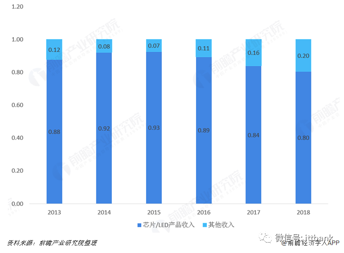 公司主營業(yè)為為LED芯片業(yè)務,2013-2018年,公司LED、芯片產(chǎn)品收入均占比公司全部營業(yè)收入的80%以上,2015年公司LED、芯片業(yè)務占比達到了93%。近年來,公司加快LED產(chǎn)業(yè)鏈的垂直一體化布局,產(chǎn)品由原來單一的外延片及芯片逐步向上游原材料(襯底、氣體)和下游高端LED應用產(chǎn)品拓展,完善全產(chǎn)業(yè)鏈生產(chǎn),公司LED芯片產(chǎn)品占比逐漸下降,材料收入占比逐漸上升,打造LED芯片全產(chǎn)業(yè)鏈布局。2018年,公司芯片及LED產(chǎn)品收入67.33億元,較上年同比下降4.43%;材料、廢料銷售收入14.19億元,較上年同比上升42.67%。