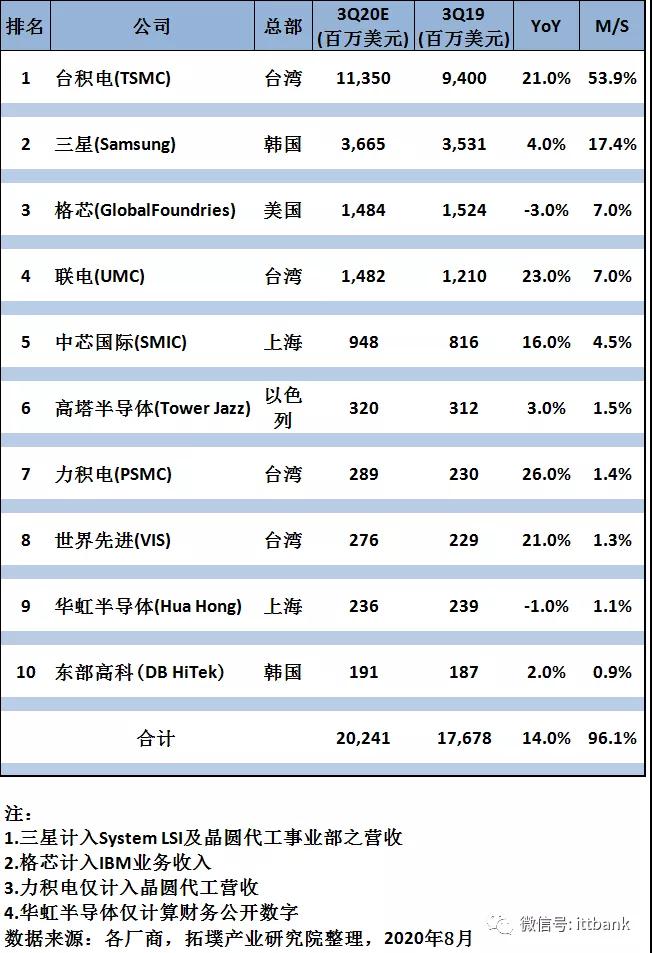 2020年第三季度全球前十大晶圓代工廠營收預測排名