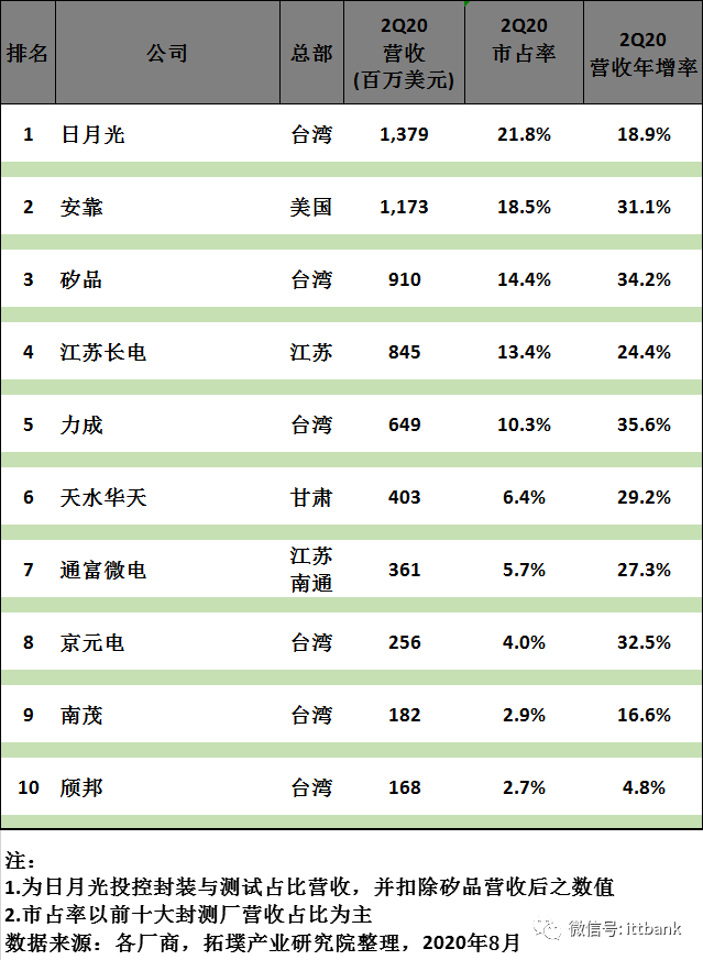 2020年第二季全球前十大封測業(yè)者營收預測排名