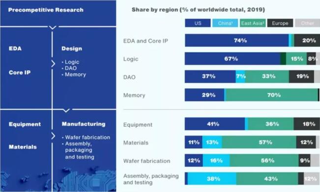 從上圖看中國在全球市場的份額更加具體。在芯片設(shè)計(jì)方面,EDA/IP領(lǐng)域中國僅占3%,DAO領(lǐng)域占7%,邏輯芯片與存儲器芯片領(lǐng)域更是少得可憐,與美國云泥之別;在晶圓制造方面,中國占比16%,但基本是中低端產(chǎn)品;在半導(dǎo)體產(chǎn)業(yè)鏈三環(huán)節(jié)中非核心的封裝測試方面,中國占比38%;在半導(dǎo)體材料方面,中國占比13%,但是在SiC、GaN等第三代半導(dǎo)體材料發(fā)展上仍落后1-2代;在半導(dǎo)體設(shè)備方面,占比微乎其微。