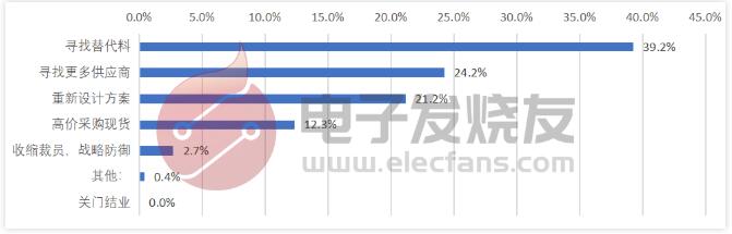 面對(duì)缺貨漲價(jià)的形勢(shì),尋找替代料的方式占比達(dá)39.2%,其次是尋找更多供應(yīng)商,占比24.2%,以及重新設(shè)計(jì)方案達(dá)21.2%。這是廠商面臨缺貨的三大對(duì)策。另外還有,高價(jià)采購(gòu)現(xiàn)貨作為必要的舉措排名第四。最不濟(jì)的恐怕就是收縮裁員、戰(zhàn)略防御,這一選項(xiàng)也有2.7%的占比,從調(diào)研來(lái)看,目前還沒(méi)有因缺貨而關(guān)門的企業(yè)。