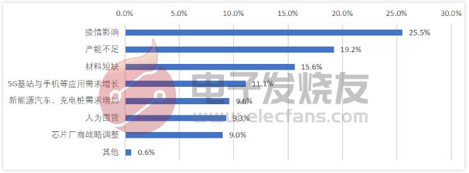 對(duì)于此次缺貨爆發(fā)的原因,從調(diào)研數(shù)據(jù)看,[敏感詞]的原因仍然是疫情影響,占比達(dá)25.5%;而產(chǎn)能不足、材料短缺等也是非常重要的因素。前三大原因?qū)儆谌蛐允录?,全靠中?guó)一己之力短期不可能解決。