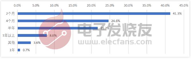 對(duì)于目前元器件出現(xiàn)延誤的情況,交期超過(guò)2個(gè)月的占比達(dá)41.3%,超過(guò)4個(gè)月的占比為24.6%,而交期超過(guò)半年的也達(dá)到了21.7%的比例,此外還有交期1年以上的占比8%。