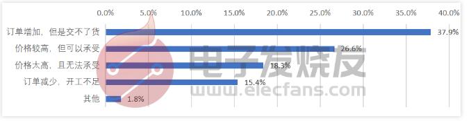 對(duì)于電子元器件缺貨造成的損失,最直接的是“訂單增加,但交不了貨”,占比達(dá)37.9%,說(shuō)明許多廠商處于等米下鍋的境地;選擇“價(jià)格較高,但可以承受”占比26.6%,表明部分廠商承受著元器件漲價(jià)的壓力;“價(jià)格太高,且無(wú)法承受”的選擇占比達(dá)18.3%。值得注意的是,高達(dá)15.4%的占比選擇了“訂單減少,開工不足”,也可以看出由于缺芯等因素,部分廠商拿不到更多的訂單。
