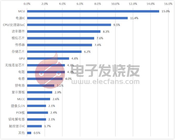 在針對(duì)目前缺貨元器件的種類的調(diào)研中,結(jié)果顯示前五大最為缺貨的元器件依次為MCU、電源IC、CPU/處理器SoC、功率器件、模擬芯片。此外,傳感器、存儲(chǔ)芯片、GPU、無(wú)線連接芯片等也占有一定比例。