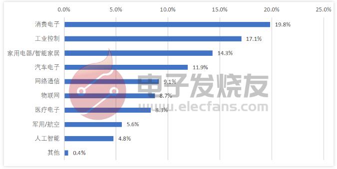 從受訪者所屬的行業(yè)來(lái)看,分布較為均勻,主要有消費(fèi)電子占19.8%,工業(yè)控制占17.1%,家用電器/智能家居占14.3%,汽車電子占11.9%,網(wǎng)絡(luò)通信占9.1%,物聯(lián)網(wǎng)占8.7%,醫(yī)療電子占8.3%。這既說(shuō)明,此次元器件缺貨現(xiàn)狀得到來(lái)自各應(yīng)用行業(yè)的普遍關(guān)注,也反映出缺貨問(wèn)題覆蓋的行業(yè)較為廣泛。