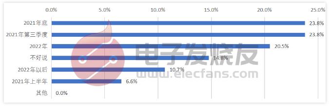 絕大多數(shù)人認(rèn)為時(shí)間點(diǎn)會(huì)在2021年第三季度及以后,認(rèn)為在2021年第三季度到年底的占比超過(guò)45%,還有20.5%的受訪者選擇了2022年。