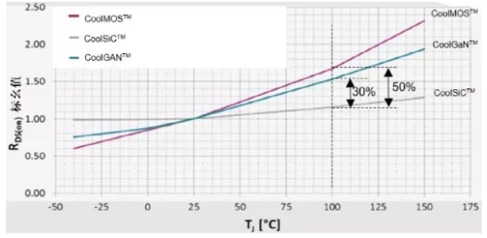 圖13:碳化硅MOSFET,氮化鎵晶體管和硅MOSFET導(dǎo)通電阻隨結(jié)溫變化曲線
