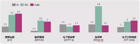 圖1:硅、碳化硅,氮化鎵三種材料關(guān)鍵特性對(duì)比