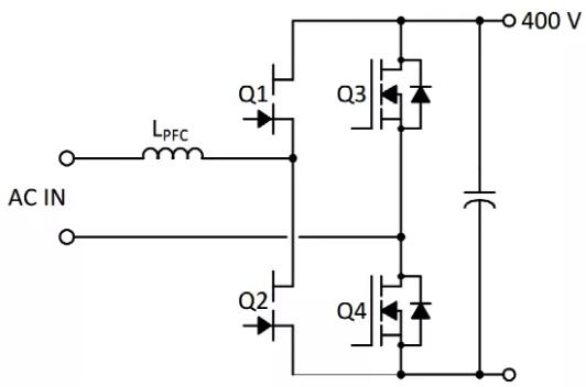 從表1所示特性可知,氮化鎵晶體管沒(méi)有體二極管但仍舊可以反向通流,因此非常適合用于需要功率開(kāi)關(guān)反向通流且會(huì)被硬關(guān)斷(hard-commutation)的電路,如電流連續(xù)模式(CCM)的圖騰柱無(wú)橋PFC中,可以獲得極高的可靠性和效率。電路拓?fù)涫疽鈭D如圖7所示。圖中Q1和Q2為氮化鎵晶體管,Q3和Q4為硅MOSFET。