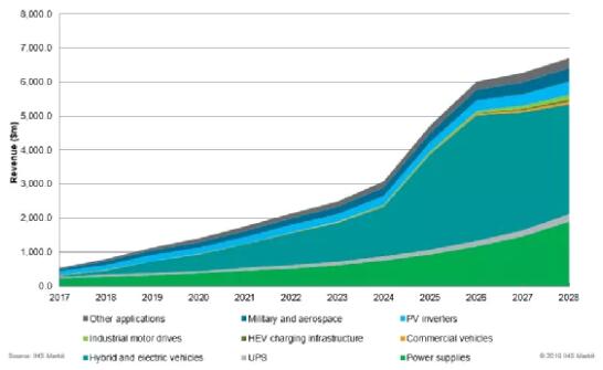 圖2:氮化鎵晶體管和碳化硅MOSFET應(yīng)用領(lǐng)域及銷(xiāo)售額預(yù)測(cè)