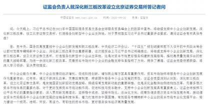 證監(jiān)會負(fù)責(zé)人就深化新三板改革設(shè)立北京證券交易所答記者問中提到,證監(jiān)會將深入貫徹新發(fā)展理念,堅持穩(wěn)中求進(jìn),堅持市場化、法治化方向,統(tǒng)籌協(xié)調(diào)多層次資本市場發(fā)展布局,推動健全資本市場服務(wù)中小企業(yè)創(chuàng)新發(fā)展的全鏈條制度體系,著力打造符合中國國情、有效服務(wù)專精特新中小企業(yè)的資本市場專業(yè)化發(fā)展平臺,努力建設(shè)一個規(guī)范、透明、開放、有活力、有韌性的資本市場,更好服務(wù)實體經(jīng)濟(jì)高質(zhì)量發(fā)展。