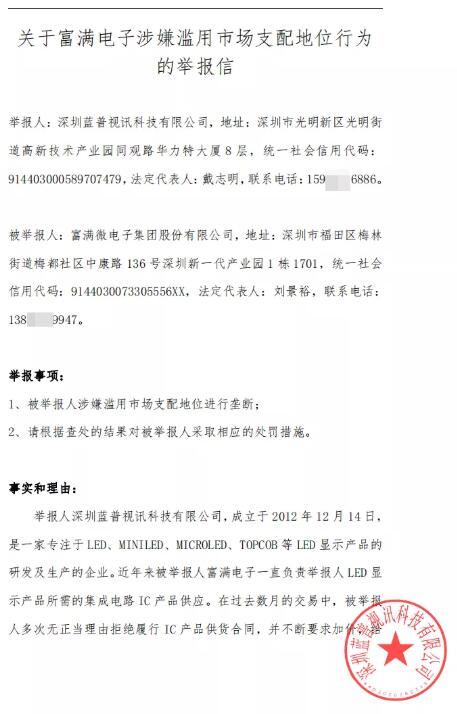 8月12日,LED電子顯示屏廠商藍普視訊在其微信公眾號上發(fā)布信息稱,實名舉報富滿電子涉嫌濫用市場支配地位壟斷相關(guān)芯片市場,其在7月8日向LED行業(yè)發(fā)出聯(lián)合訴訟倡議書后,截至目前已經(jīng)收到了行業(yè)近100家IC受害企業(yè)的聲援、9家顯示屏幕企業(yè)請求參與聯(lián)合訴訟。