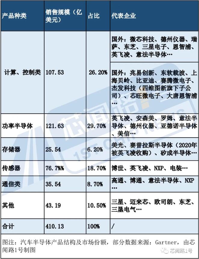 圖注:汽車半導(dǎo)體產(chǎn)品結(jié)構(gòu)及市場份額