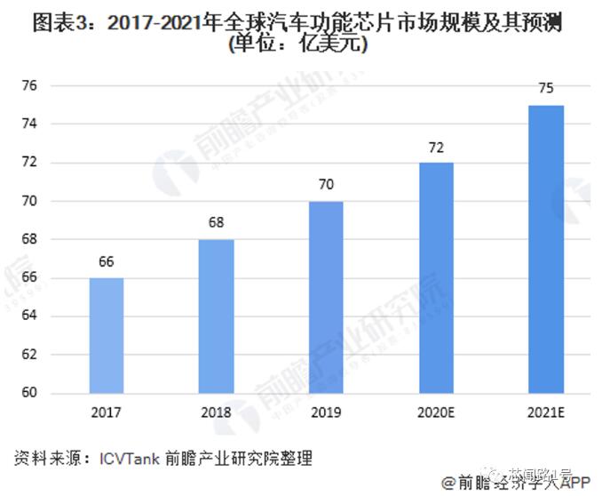 據(jù)ICVTanK的數(shù)據(jù)資料了解到,全球汽車功能芯片預(yù)計(jì)市場規(guī)模有望從2019年70億美元穩(wěn)步提升至2021年75億美元。