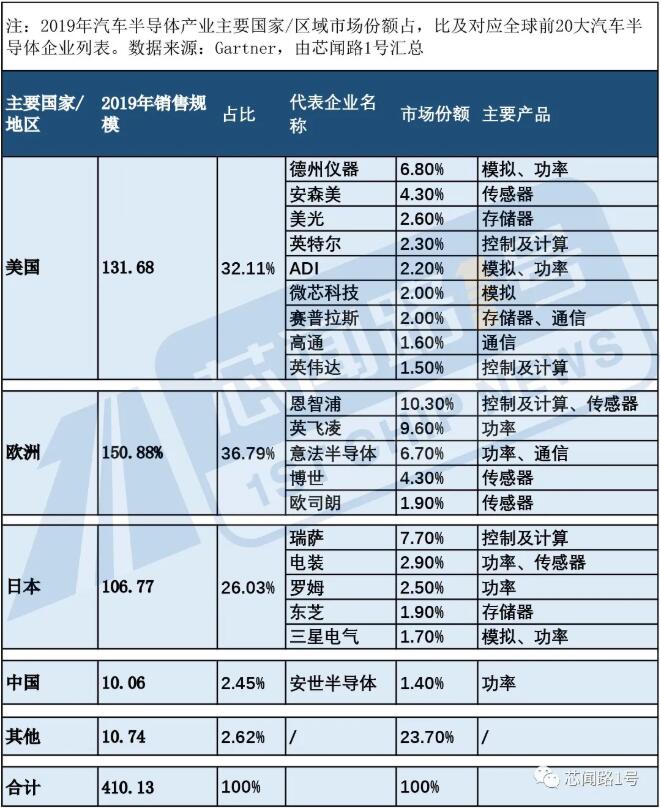 據(jù)市場研究機(jī)構(gòu)Gartner的數(shù)據(jù)顯示,歐洲汽車半導(dǎo)體2019年產(chǎn)值以150.88億美元占全球汽車半導(dǎo)體總產(chǎn)值的36.79%,市場份額全球[敏感詞];美國以全球市占率32.64%位居第二;其次日本占全球26.03%的市場份額。中國大陸2019年汽車半導(dǎo)體實(shí)現(xiàn)銷售收入僅為10億美元左右,占比不到3%,和歐美日相比,差距很大。